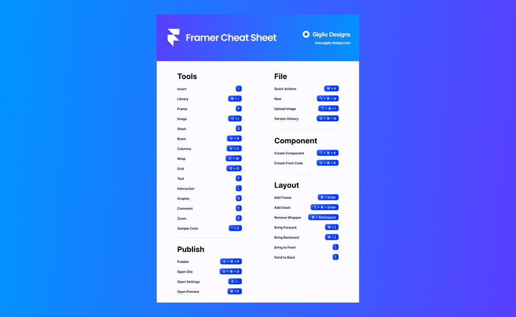 This free resource provides quick access to essential shortcuts for navigating Framer's powerful features.